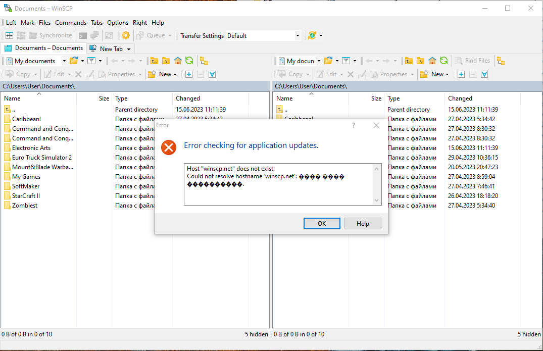 On the codepage win1251 for non-utf symbols I'm getting this window when trying to update WinSCP (6.1) without internet. This codepage bug affects all languages. There could be more of them, but I found only one.