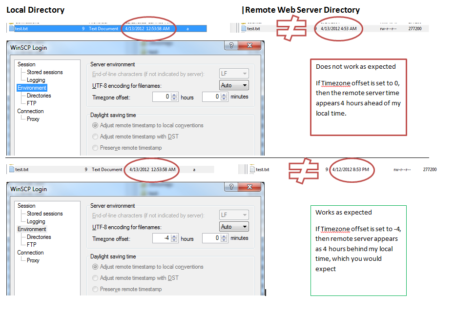 When using WinSCP to view standard FTP access of an Ipower hosting site, the uploaded times on the remote server are exactly 4 hours ahead of my local time. This means that a file I upload at 6 pm will show a 10 pm remote time. This may or may not be related, but GMT time is 4 hours ahead of my local time. The problem does not appear to occur when using FileZilla (I prefer WinSCP). Also, when I use the time zone offset, it offsets the remote server time using my current time (i.e. if my local time is 6 pm, it will show 2 pm when I use the WinSCP Timezone offset of -4 hours)