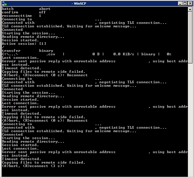 The put commnd is currently failing due to a network configuration issue on our target server (our problem, definitely not WinSCP's), and when it fails, WinSCP prompts for: "(A)bort, (R)econnect". No matter what combination of "option batch" and "option confirm" I use, it will always Reconnect if no response is provided. If run without the console, via WinSCP.com, again it chooses Reconnect every time.