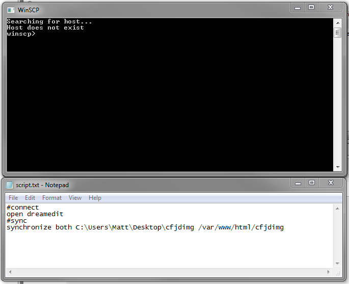 I have a bit of an issue. All I want to do is synchronize a local directory to my ftp server at regular intervals. I can do this manually through the command window, but when I try to automate it fails.