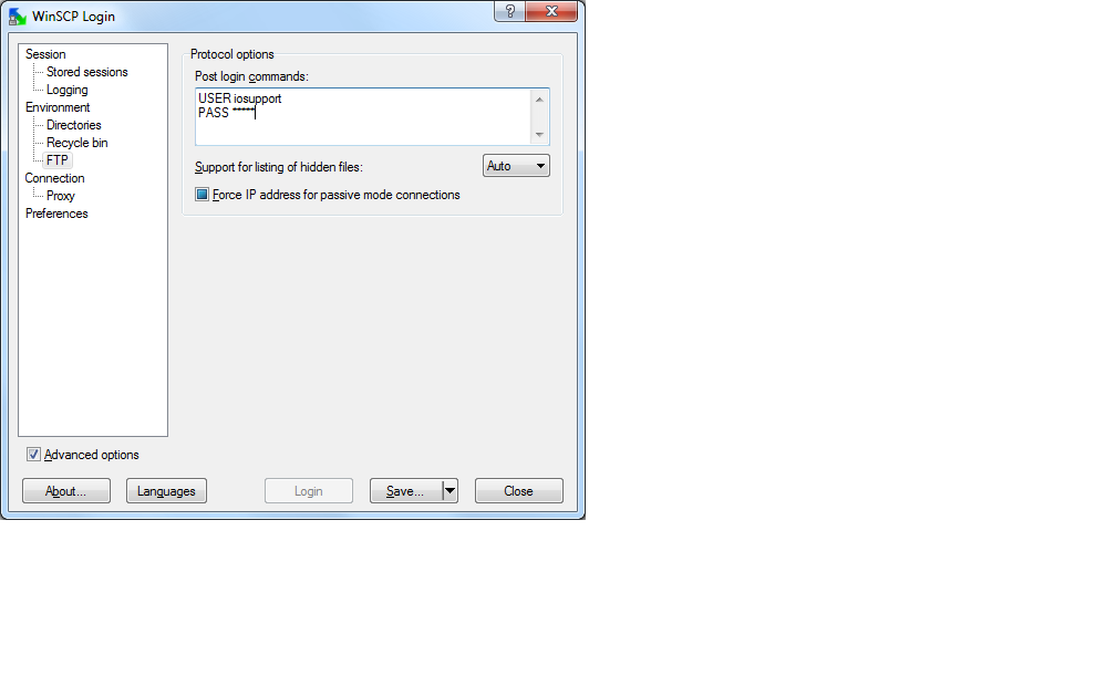 The problem is that WinSCP only sends the first command (USER iosupport) and not the second command (PASS *****). So, because of this, WinSCP cannot be used because the password is never sent. By the way, it looks as if WinSCP sends these post login commands as literals, so just typing USER iosupport <password> won't work. However, literals also work on command line, but again the problem here is that WinSCP doesn't even attempt to pass the second command.
