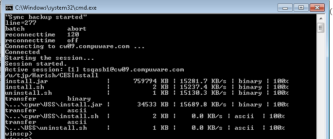 C:\Documents and Settings\a160559\Desktop> C:\Documents and Settings\a160559\Desktop>Tran_3 C:\Documents and Settings\a160559\Desktop>WinSCP /command "option batch continue" "option confirm off" "open HPAY_UAT" " lcd D:\DSC_TRANS\FILES\" "cd /home/oracle/dsc_files/" "put 3.TIFF /home/oracle/dsc_files/" /log="D:\DSC_TRANS\LOGS\3.TIF F.log" "exit" Searching for host... Host does not exist batch continue confirm off Searching for host... Connecting to host... Authenticating... Using username "oracle". Authenticating with pre-entered password. Authenticated. Starting the session... Reading remote directory... Session started. Active session: [1] HPAY_UAT D:\DSC_TRANS\FILES /home/oracle/dsc_files 3.TIFF | 0 KiB | 0.0 KiB/s | binary | 100% winscp> winscp> winscp>