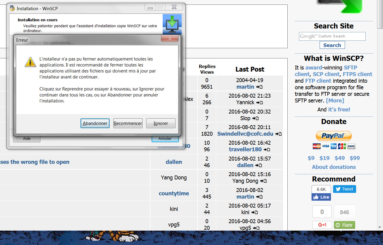 - the updater program stalled, telling it couldn't terminate the process (while there were no winscp-anything processes at all, save the current setup program)