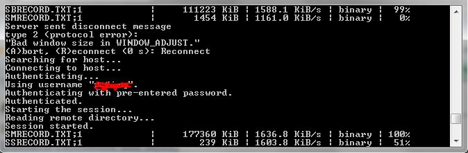 1. I get an error message "Bad window size in WINDOW_ADJUST". I do not know why I get this message and cannot find anything to help me explain. This by itself is not a big problem (but it would be nice to understand and fix it) because WINSCP reconnects automatically and tries to continue.