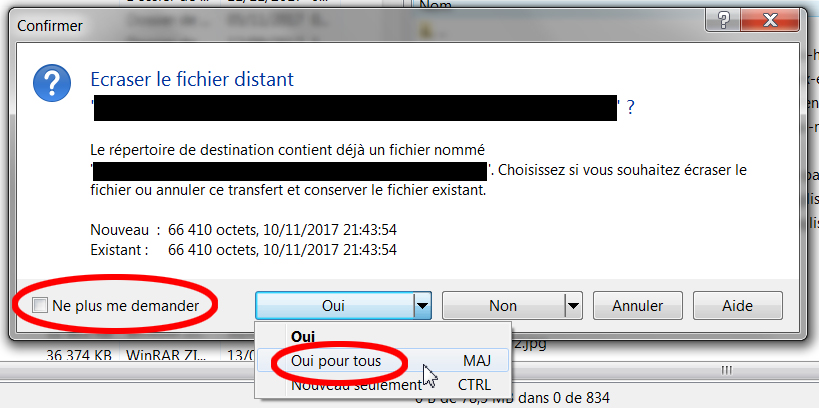 A screenshot. It's a French dialogue (baguette represent) but to make it easier, I surrounded in red the two areas that seem to offer the same functionality, Yes for all, and Don't ask again, to keep on overwriting without requiring an additional confirmation.