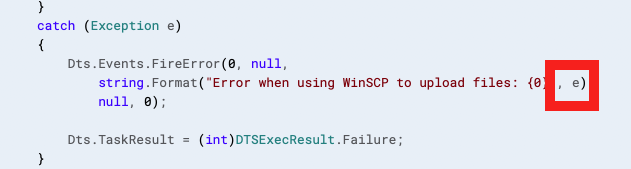 1. the source code provided in csharp for integrating winscp in SSIS package uses a try/except construct. In the exception part, the demo code simply 'spits' out the exception object, but I learned the hard way (see point 2) that the 'real' error message is in the 'innerexception' property of the exception object. I would propose to adapt the demo code to 'spit' out the e.InnerException by default.