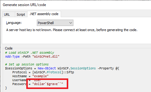 I ran into this issue today. The code generator in WinSCP 6.1.1 generates PowerShell code with double quotes. I happen to have a password with both a grave and a dollar sign in the password, and both of those are special characters with double-quoted string literals.