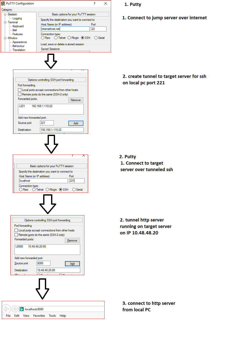 I need connect to server in local lan on port e.g. 80 (port is running on different VLANs). Is it possible to add additional tunneling on that serveru? I use putty and I add ports manually. It is not so comfort because I have hundreds of ports ...