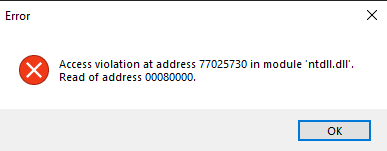 Getting an Access Violation at address 77025730 in module 'ntdll.dll'.