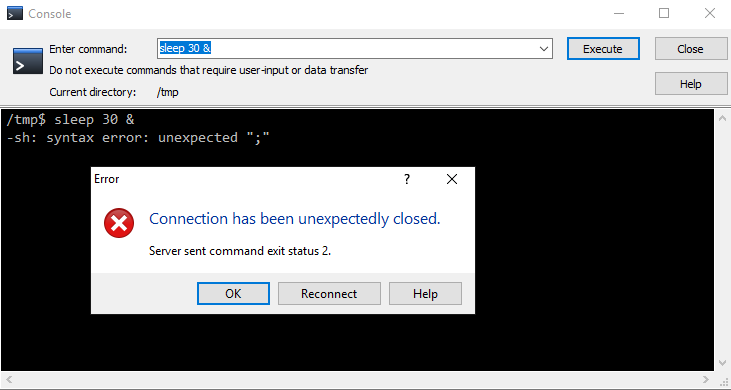 The error can be reproduced when opening the Console in WinSCP and try "sleep 30 &" (just for example).