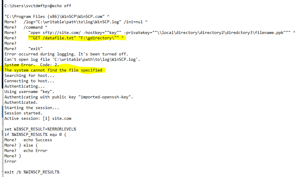 get command into a batch file, however between the syntax and the help screens this WinSCP is like no other to figure out. Need to get from an SFTP and pull to a local. Generated the transfer code in the GUI but inserting the additional command is not working. please advise.