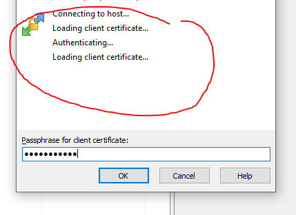 On the initial login WinSCP asks three times (!) for a password. First for the (1) certificate password then for the (2) user password and finally again (3) for the certificate password. This issue seems to be related to the 2-step authentication method of the server and may help on analyzing.