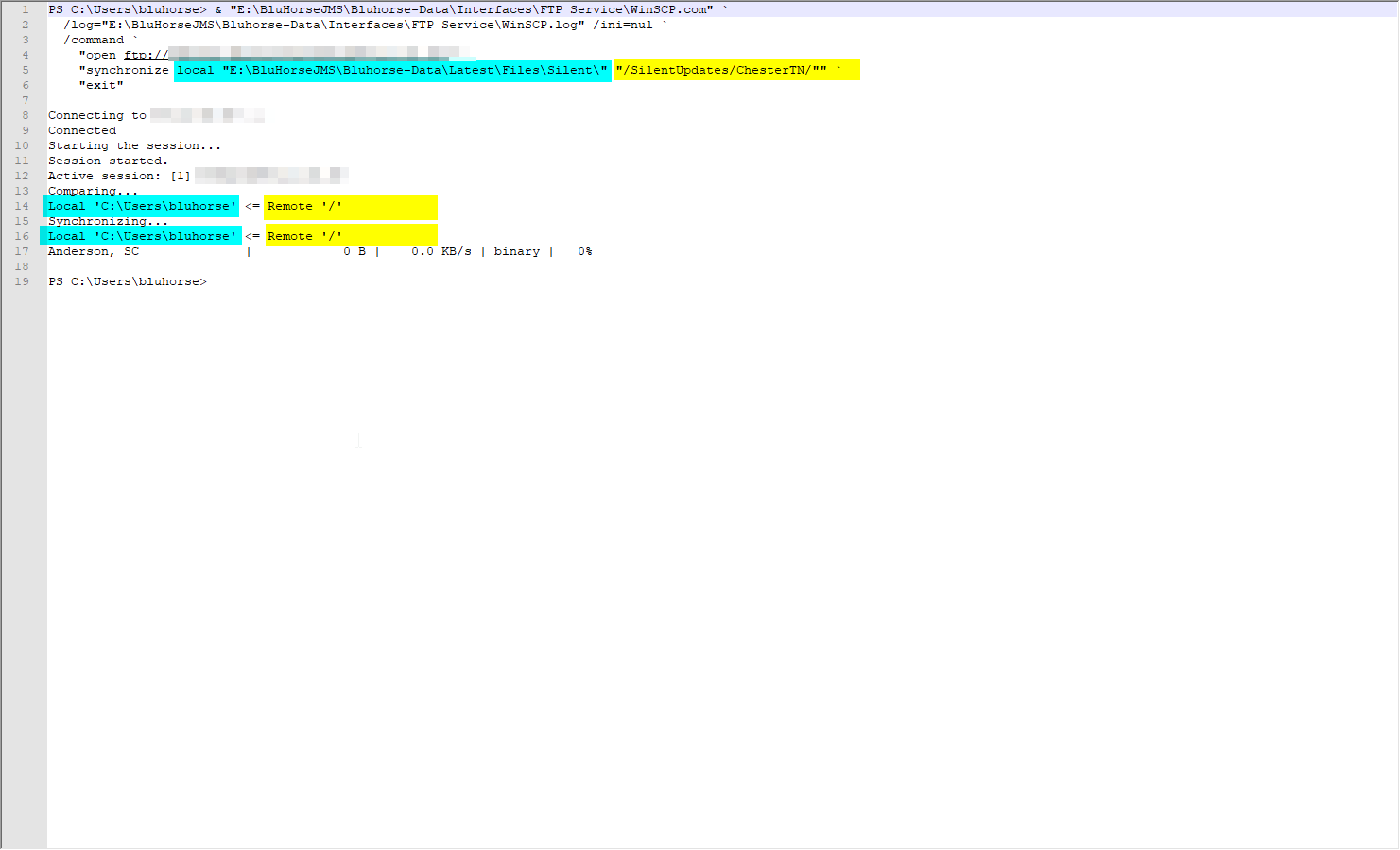 PS C:\Users\bluhorse> & "E:\BluHorseJMS\Bluhorse-Data\Interfaces\FTP Service\WinSCP.com" ` /log="E:\BluHorseJMS\Bluhorse-Data\Interfaces\FTP Service\WinSCP.log" /ini=nul ` /command ` "open ftp://???" ` "synchronize local "E:\BluHorseJMS\Bluhorse-Data\Latest\Files\Silent\" "/SilentUpdates/ChesterTN/"" ` "exit"