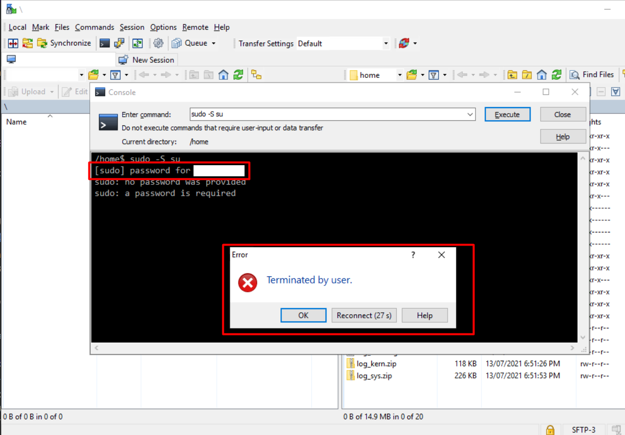 I has ubuntu on remote server and when i try request password for 'su' and other commands, i get error 'Terminated by user'. Can somebody help me.