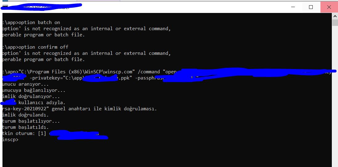 option batch on option confirm off "C:\Program Files (x86)\WinSCP\winscp.com" /command "open sftp://xxx:[email protected]:22 -hostkey="rsa-key-20210922" -privatekey="C:\app\xxx_private.ppk" -passphrase="xxxxx"" option transfer binary cd /simple/millnet/xxx put "C:\app\deneme.txt" close exit
