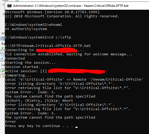 @echo off Set DateTime=%date:~10%-%date:~4,2%-%date:~7,2%_%time:~0,2%.%time:~3,2%.%time:~6,2% REM echo %DateTime% Set SourcePath=V:\Critical-Offsite Set DestinationPath=/Veeam/Critical-Offsite "C:\Program Files (x86)\WinSCP\WinSCP.com" ^ /log="C:\SFTP\logs\Veeam.Critical.Offsite.SFTP_%DateTime%.log" /ini=nul ^ /command ^ "open ftps://user:[email protected]/ -certificate=""xxxxxxxxxxxxxxxxxxxxxxxxxxxxxxxxxx""" ^ "synchronize remote -delete %SourcePath% %DestinationPath%" ^ "exit" set WINSCP_RESULT=%ERRORLEVEL% if %WINSCP_RESULT% equ 0 ( echo Success ) else ( echo Error ) exit /b %WINSCP_RESULT%