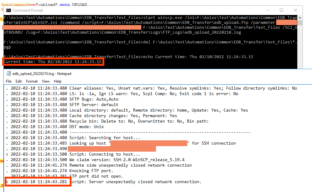 start winscp.exe /ini=F:\Axios\Test\Automations\Common\EDB_Transfer\WinSCP\WinSCP.ini /command script=F:\Axios\Test\Automations\Common\EDB_Transfer\edb_upload.ftp /parameter ftp.server.my myusername password localfolder destinationftpfolder /Log=F:\Axios\Test\Automations\Common\EDB_Transfer\Logs\FTP_Logs\edb_upload_20220210.log