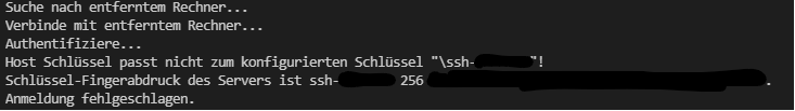 Looking for remote computer... Connecting to remote computer... Authenticating... Hostkey does not match konfigured key "\ssh-XXXXXXX"! Server Key-Fingerprint is ssh-XXXXXXX 256 XXXXXXXXXXXXXXXXXXXXXXXXXXXXXXXXXXXXXXX Sign-up failed.
