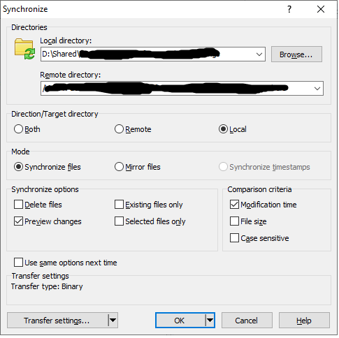 In addition, the "Use same options next time" checkbox doesn't save the Target Directory option, it simply reverts back to remote the next time I open the synchronize window.