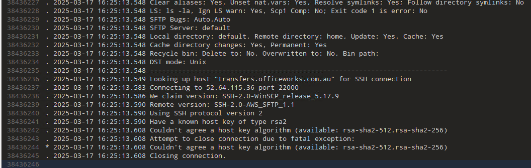 . 2025-03-20 14:53:36.886 Couldn't agree a host key algorithm (available: rsa-sha2-512,rsa-sha2-256)