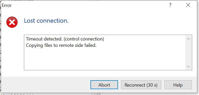 Lost connection - ("Timeout detected. (control connection)","Copying files to remote side failed.
