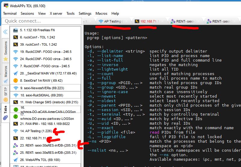 I would ideally like to see a side window (or pop-out type window) that would show ALL tabs you have currently open. (ie like how MobaXterm SSH client does this – see img below)
