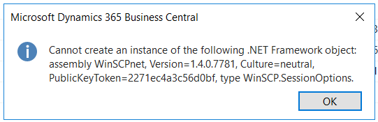 Cannot create an instance of the following .NET Framework object: assembly WinSCPnet, Version=1.4.0.7781, Culture=neutral, PublicKeyToken=2271ec4a3c56d0bf, type WinSCP.SessionOptions.