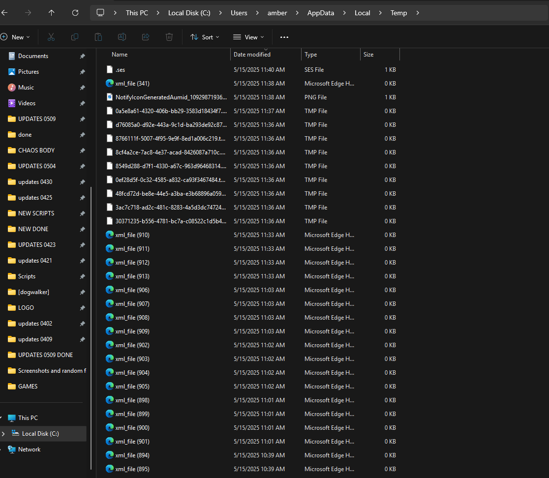 C:\Users\username\AppData\Local\Temp) and I see a bunch of files like this (screenshot). So would the file be an XML file with a different number? Can you provide a screenshot of what the file should look like or be named? I am still having trouble knowing exactly what to send you.