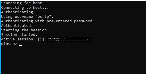 C: cd C:\Program Files (x86)\WinSCP .\winscp [email protected] /password=hello put -delete "T:\IMEI-SFTP\Batelco\stcMEIBlock*.csv" /IMEIBLACKLIST/BATELCO/IN/ exit