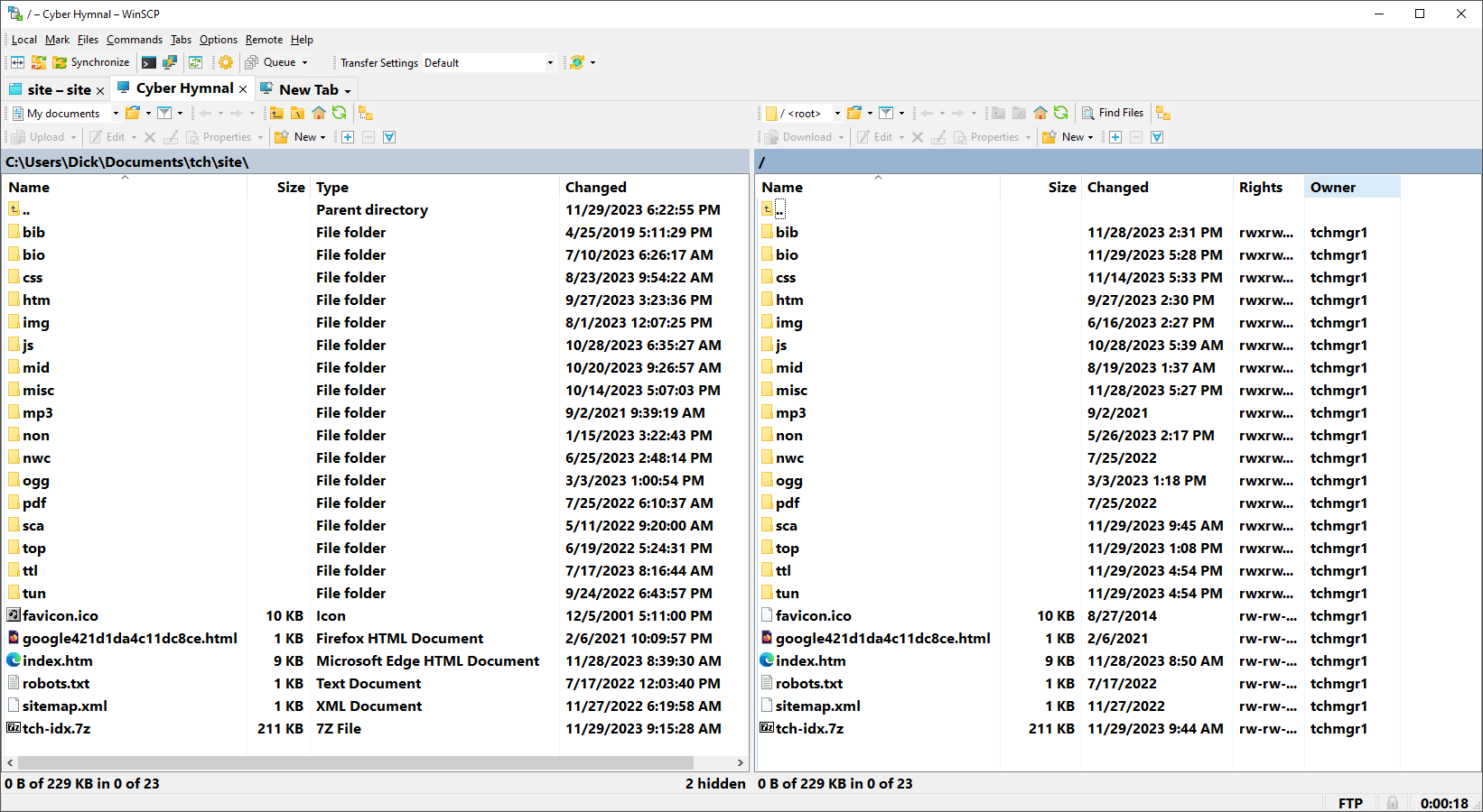 So WinSCP is opening a workspace with two tabs (local tab and “Cyber Hymnal” remote tab).