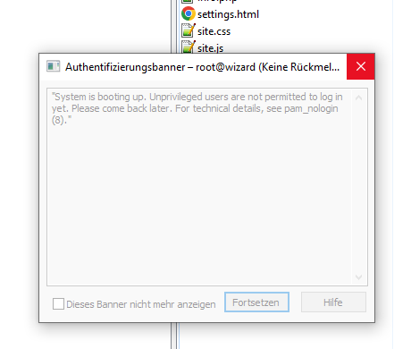 when I restart the server (Raspberry Pi) with an existing SFTP connection, the authentication banner appears and a short time later WinSCP freezes reproducibly. See attachment.
