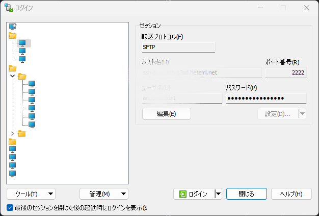 Since the last year, WinSCP has been launched with a blank window of saved connections, and halted soon. It has happened in the most cases on my desktop (Ryzen 5 + 16GB RAM + Windows 11 Home), so I tried to install 6.2 RC but the same result should be given as the attachment image shows. (Many entries on the left pane are vanished. By the way, the saved host name and user name are hidden by me with Paint 3D for the reason of, yes, security!)
