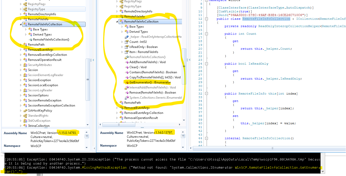 WinSCPnet.dll 6.3 missingMethodExceptions : RemoteFileInfoCollection.GetEnumerator