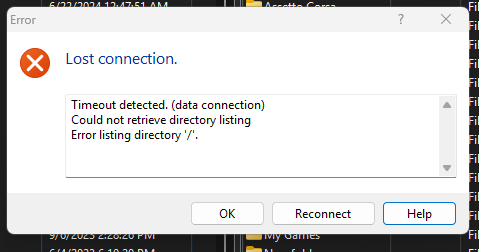 Please help very annoying. 3 other people can login but for some reason I cannot!Lost Connection. Timeout detected. [data connection] Could not retrieve directory listing Error listing directory '/'.