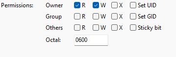 0600, the GUI labels in Portuguese appear to be mismatched. The section labeled "Outros" shows read/write permissions, while “Proprietário” and “Grupo” show none – despite the octal value being correct. This causes confusion and may lead users to misconfigure permissions.