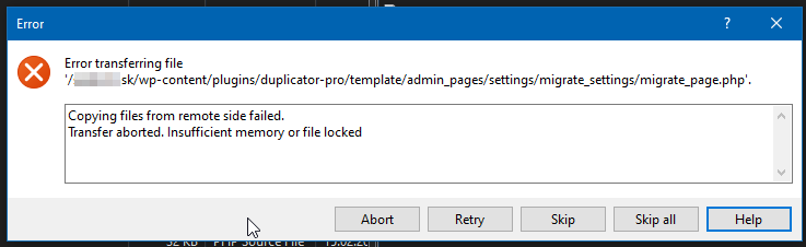 Transfer aborted, Insufficient memory or file locked