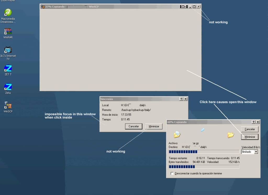 then a window shows the transference process with two buttons: "Cancel" and "Minimize".
