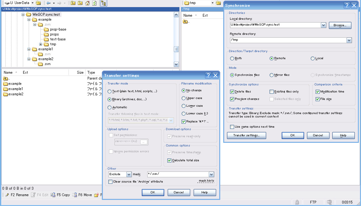 I've uploaded none of 3 example directories yet with exclude mask */.svn/.