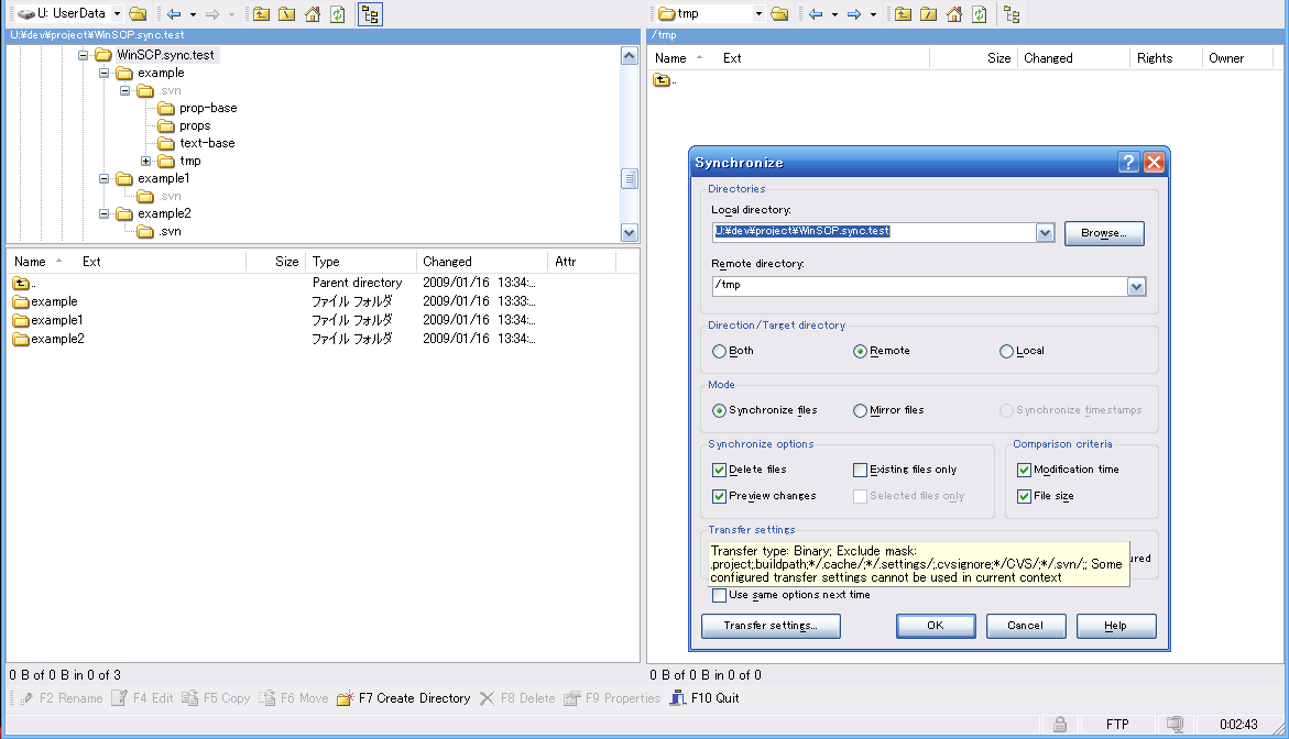 When I drag the example directory, Synchronize with exclude mask such as below.