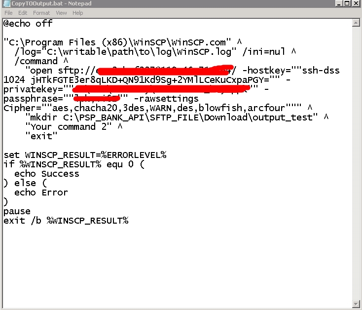 When I run below script, it's still giving error, while this script is generated from WinSCP GUI (Generate session URL/code). Now when I use command line then same user & password works normally but it does not work in script mode and give error. So, how do I fix this issue?