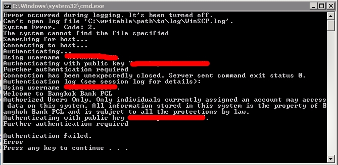 batch on confirm off Searching for host... Connecting to host... Authenticating... Using username "user". Authenticating with pre-entered password. Connection has been unexpectedly closed. Server sent command exit status 0. Authentication log (see session log for details): Using username "user". Authentication failed.
